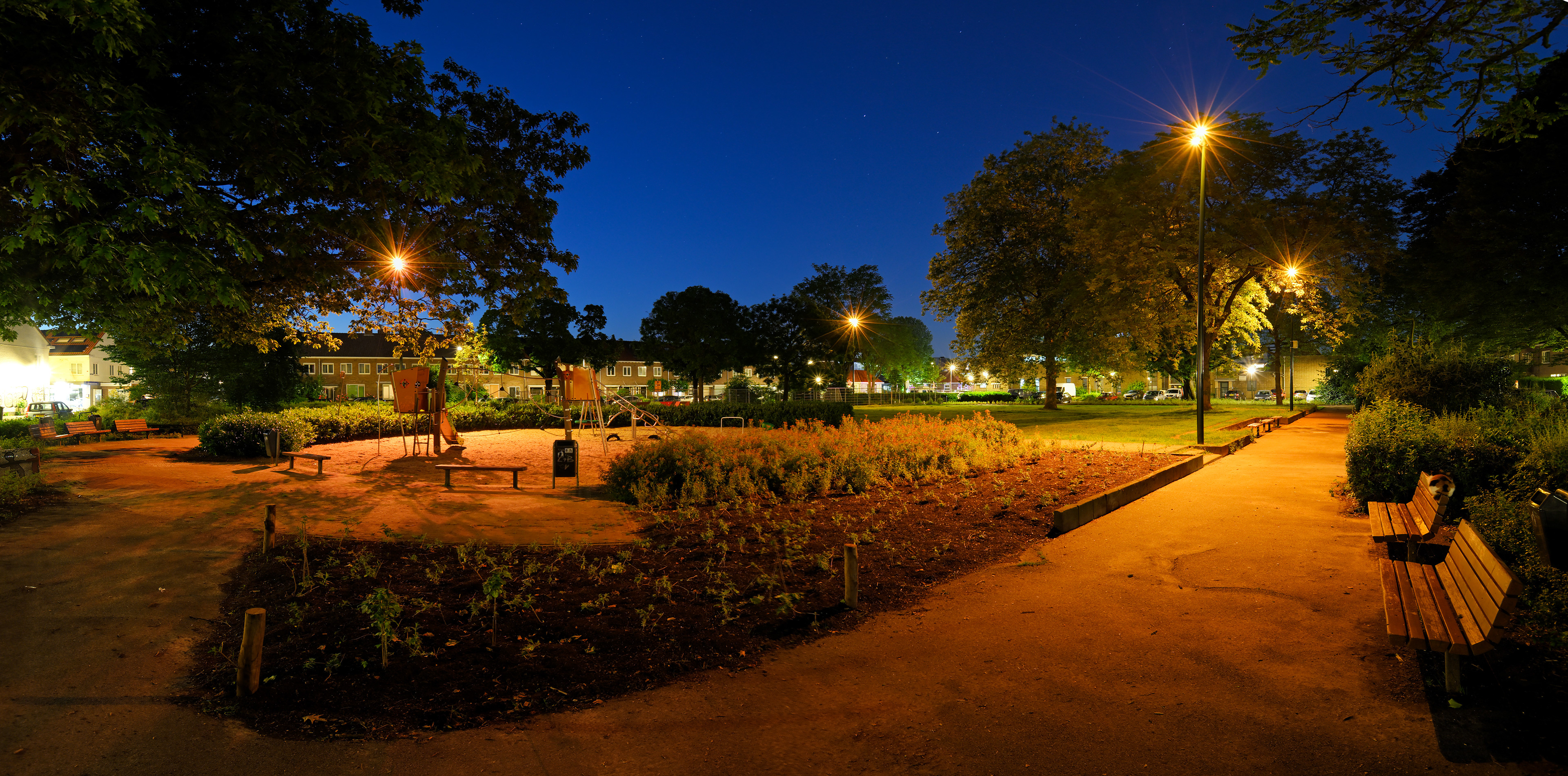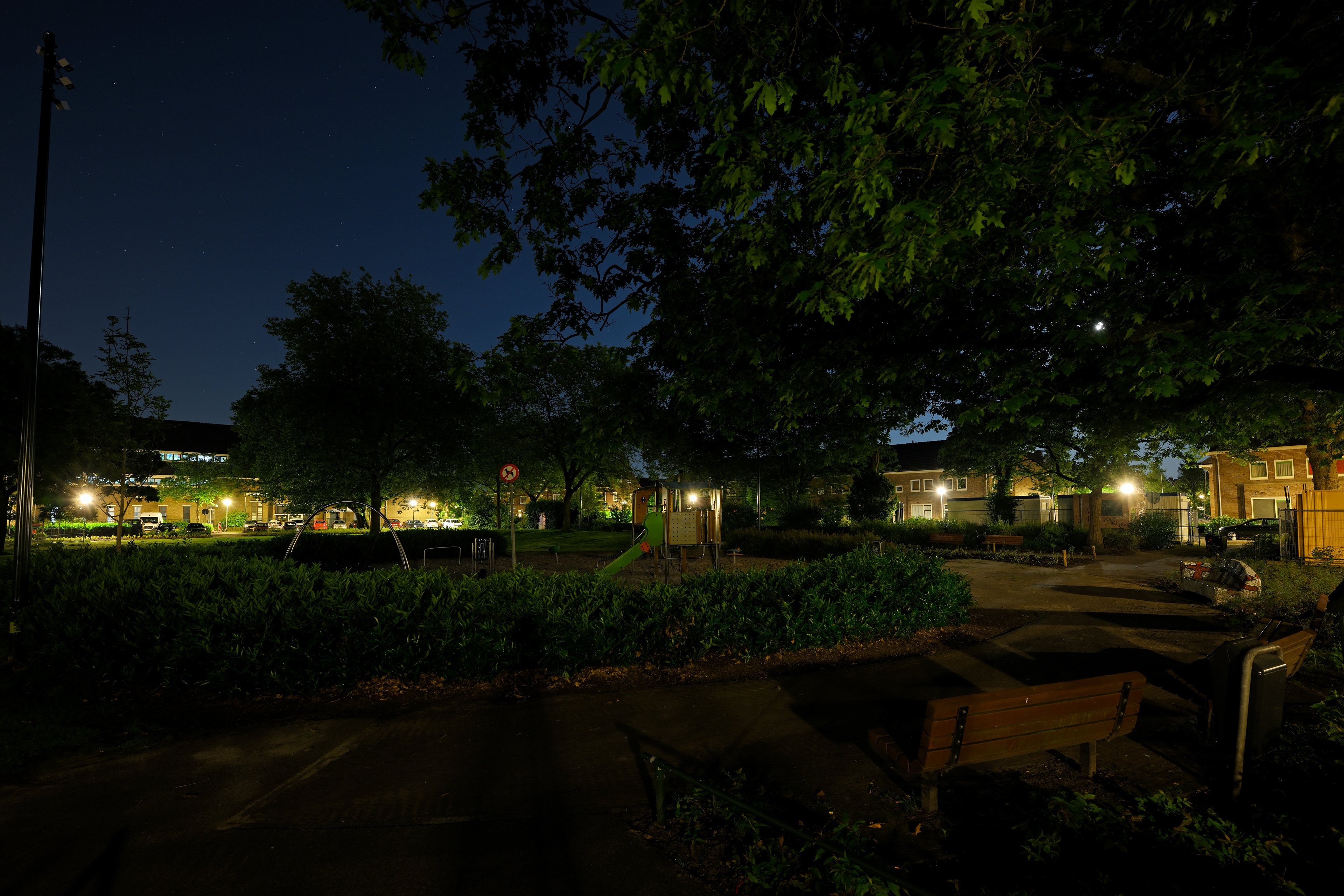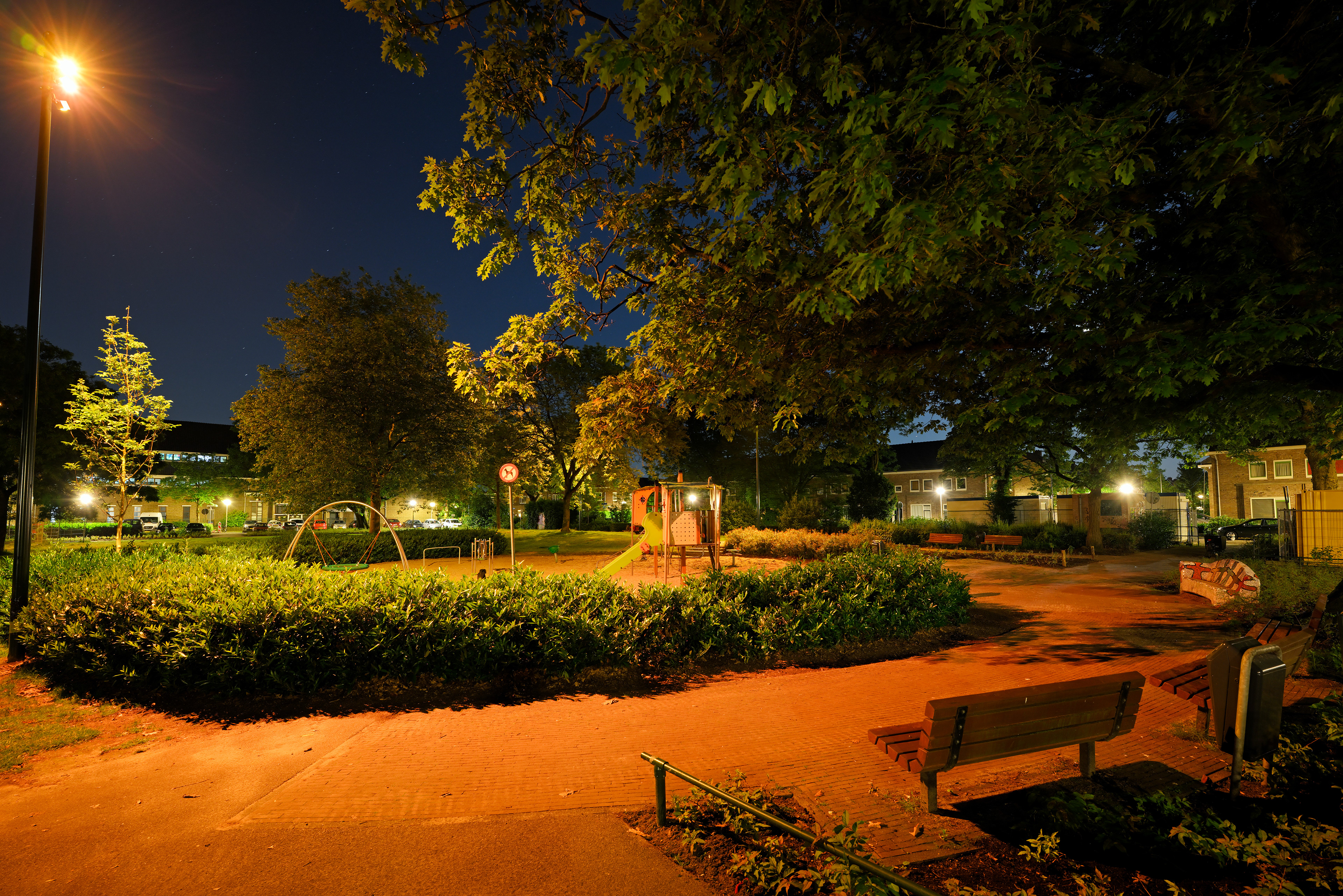 Op het Kerstroosplein in Eindhoven ontwierp hetluxlab samen met Philip Ross een lichtplan dat mens, natuur en energieverbruik subtiel in balans brengt. Het groene buurtplein was ’s avonds lange tijd donker en werd als onveilig ervaren; nu zorgen zorgvuldig gedimde, warm-witte lichtscènes voor oriëntatie en sociale veiligheid, zonder onnodige verstoring van flora en fauna. De lichtniveaus en kleurtemperaturen veranderen mee met het gebruik van de ruimte – van rustige avondwandeling tot spelende kinderen aan het begin van de avond – waardoor alleen licht brandt waar en wanneer het nodig is. Zo laat hetluxlab zien hoe duurzame openbare verlichting in Eindhoven niet draait om méér lux, maar om slimmer, zachter licht dat de leefkwaliteit van bewoners én het ecosysteem versterkt.